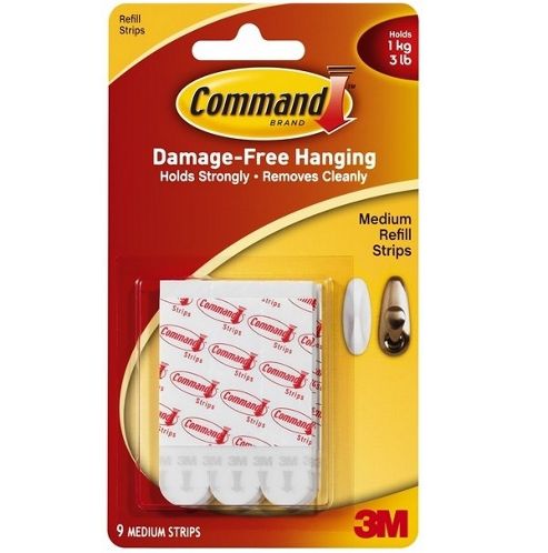 1 pack of 9 adhesive strips.Re-use your Command hooks & hangers with these replacement Command Strips.Medium size adhesive strips - use on their own or with a range of Command products.Can be used independently to mount items such as photo's, cards, phones and other light items. High performance adhesive - holds on strongly.Easy to put up - no need for nails or screws.Easy to remove - innovative stretch release technology leaves no surface damage.Each medium strip holds up to 450g (1 lb).Dimensions - 70mm x 16mm x 1mm.