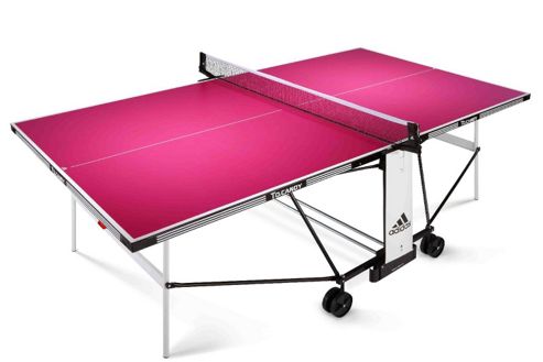 Adidas table tennis brings colour to the game! This cool candy pink finish offers a stylish alternative to the leisure market with our fresh and unique approach. This outdoor weather-proof table boasts a 4.5 mm melamine UV protected playing surface perfect for outdoor players of all ages. Designed and built in Germany this table delivers unrivalled stylish design and superior construction. The table is tilt resistant due to the low gravity centre offers a playback position perfect for practice and improving your skills. It has double steerable 125mm wheels and a permanently installed height adjustable Comp II net. The table includes a ball holder for 8 balls. Using the Easy Fold System 2.0 the table takes seconds to set up and put away, ensuring that your time is spent purely on playing the game. Add some colour to your game!