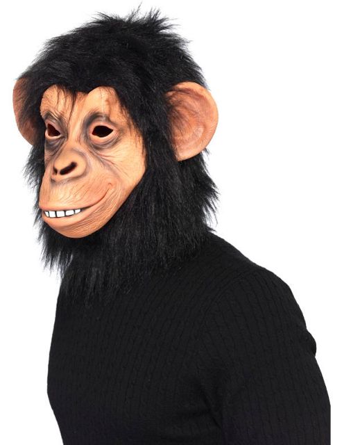 Full overhead chimpanzee mask with a realistic latex face and ears. The mask is covered with black faux fur.