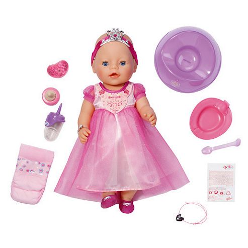 Give your Baby Born Interactive Princess Doll extraspecial care She comes with her own beautiful fairy tale outfit elegant little slippers and a headband with tiara. Your Baby Born Princess doll also has eight lifelike functions. Give Baby Born a drink from her bottle put her on the potty and even comfort her when she cries. She behaves just like a real baby so make sure she gets the attention she deserves. Use the 10 accessories to keep your little Princess as happy as can be. Nothings too good for the kings daughterSuitable for ages 3 years Safety InformationWarning. Not suitable for Children under 3 years.