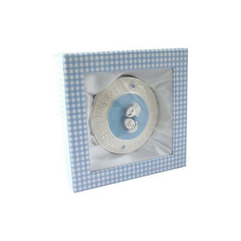 A lovely silver plated first keepsake box for a baby boy. Round design with mother of pearl finish surround lid with two blue crystals and two baby shoes. Blue velvet lining. Size 6.5cm diameter. Ideal new baby or christening gift for a little boy. Gift boxed as shown.