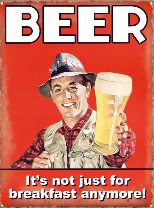 A 30x40cm tin sign featuring beer not just for breakfast.