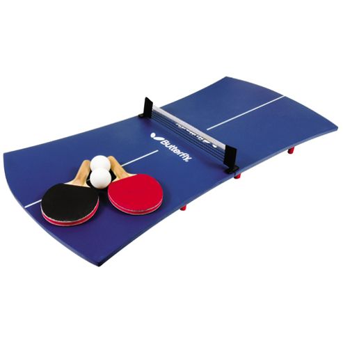 A great fun sized table tennis table with a unique flare design shape and 12mm wooden playing surface. Suitable for all ages and for playing anywhere, the table simply folds in half for storage. The set comes complete with two mini bats, net and post set and 2 full size balls.