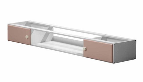This under bed furniture has two cupboards, one each end of a joining shelf and is the ideal storage solution which will fit perfectly under a normal length bunk bed or bed frame. Made in solid pine. Colour white pine finish with pink mdf detail. Our products comply with the European standard EN 71-3.