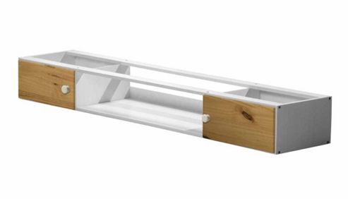 This under bed furniture has two cupboards, one each end of a joining shelf and is the ideal storage solution which will fit perfectly under a normal length bunk bed or bed frame. Made in solid pine. Colour White pine finish with white mdf detail. Our products comply with the European standard EN 71-3.