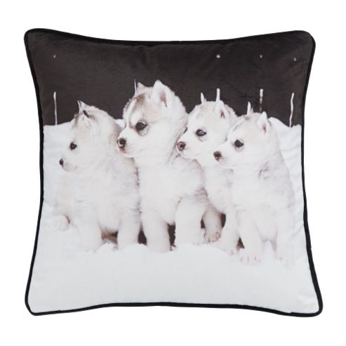 Catherine Lansfield Home Cosy Corner Huskies Multi Cushion Cover. Cute printed husky cushion, 4 huskies sitting in the snow. Polyester velvet. Symbols: 30 Degree, Do not bleach, Do not Tumble dry, Do not iron, Do not dry clean. Additional Comments: Wash...