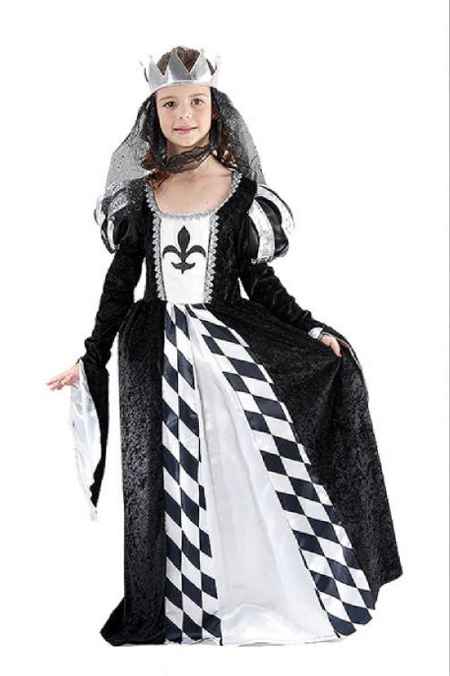 Chess Queen - Child Costume - Small: Age 5-6 Height:110-116cm Chest:up to 58cm Waist: up to 55cm - Please note: We remeasure our costumes so you can be confident they all adhere to the same standard, as such, the size printed on the packaging may differ from the size we display. - Includes: Dress and matching headpiece. - The game is on!.... Glide into the party in this luxurious, black velvet dress which has a slim fitting, stretch bodice, trimmed with silver braid and a central satin panel decorated with a fleur de lys applique. The dress boasts balloon style sleves with satin lined, open drapes, checkerboard satin panel to front with an elasticated waist for comfort and a short, textured base layer for volume. Also included is a silver, fabric crown with a black, sparkling, semi-sheer scarf to be attached with velcro. A lavish and exquisite costume suitable for Medieval Fayres, Renaissance and many historical themed occasions. - Fastening: Headpiece has velcro fastening. - Cleaning Care: Hand wash. Do not use bleach.
