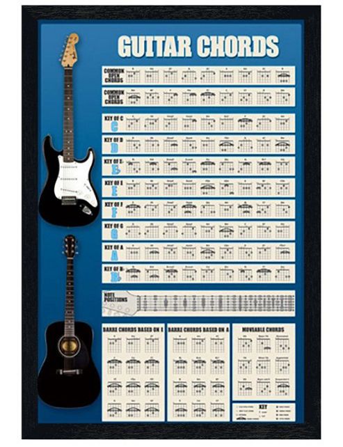 A 61x91.5cm gloss black framed poster featuring chord diagrams guitar chords.