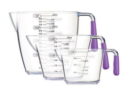 This set of three acrylic measuring jugs features coloured, shaped handles for a comfortable grip as well as displaying cup, fluid ounce, millilitre and pint measurements on the exterior, they are ideal for use when following recipes. The three sizes...