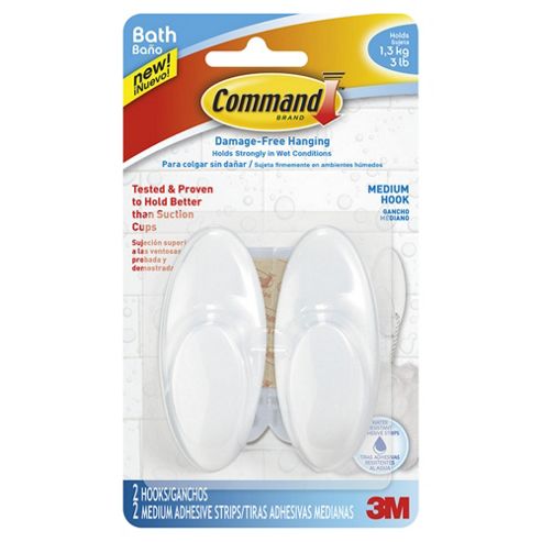 Help keep your bathroom tidy with these 2 Command medium bathroom hooks, inside and out of the shower. These plastic, adhesive bathrooms hooks by Command are water-resistant, being able to withstand hot, wet and humid environments. The Command hook is...