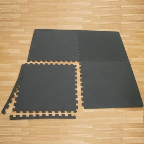 Confidence EVA Interlocking Floor Tiles.. Protect your floors and convert any room into a home gym with these durable interlocking foam gym mats. 1.1cm thick dense tiles will withstand the heaviest of punishment such as from treadmills, ellipticals, weights benches and multi gyms... But these tiles are far more versatile than just being used for fitness - other uses include:. Place machinery like washing machines on top of these tiles to reduce vibrations and noise. Line your garage or workshop floor to reduce the impact and strain of working on concrete. Use around washing or wet floor areas - these tiles have a wet surface coefficient of friction of 0.89, so will provide vital grip even when wet. Use by the back door so the kids don't get mud on your carpet - these tiles are easily cleaned with a wet cloth. Use in playrooms to prevent bumps. Or just pick and choose and move them around to suit the occasion thanks to the easy interlocking edges. You can extend as many of these as you want, to cover much bigger surface areas. Each pack of 4 includes 8 edging strips, so you can create any square or rectangular shape in almost any size!.. Features:. High density EVA foam absorbs shock, protecting floor and reducing noise. 4 Interlocking pieces cover 1.48 sq metres/16 square feet (multiple sets can be purchased and connected to cover big areas). Simple locking system with oversized teeth for long life. Easy clean, non-porous and non-absorbent means it won't absorb spills or smells. Great for home gyms, weight rooms, children's play areas, studios, aerobics and so much more. Specification. Each individual tile measures 62.5 x 62.5 x 1.1 cm (edging strips add 2cm). 1.1cm thick. Compression 30% at 50psi. 100% EVA Rubber Foam with wire mesh anti-slip texture on top. Pack contains 4 interlocking mats, and 8 edging strips.