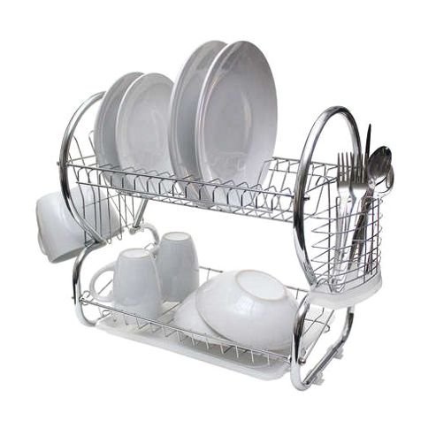 Versatile and easy to assemble dish rack 2 shelves: top shelve 15 slots and lower shelf 12 slots. 1 detachable utensil holder. 1 detachable cup holder. 1 removable drip tray. Chrome steel wire body. Assembled Rack Size: H40 x W51.50 x D26.50cm Colour: Red