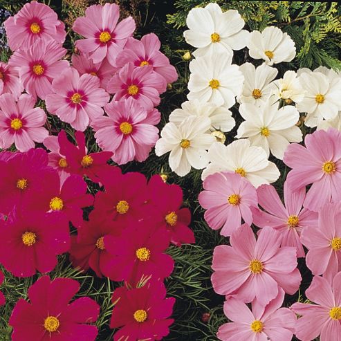 An RHS AGM variety in a superb mixture of colours. This beautiful dwarf variety reaches a maximum height of 60cm (24"') making it perfectly proportioned for sunny borders and containers. The 8cm (3"') wide, daisy-like blooms of Cosmos 'Sonata Series Mixed' float above the finest lacy foliage. The strong stems and long vase life of this compact annual make them ideal for cutting for a colourful bouquet. Height: 60cm (24"'). Spread: 45cm (18"')