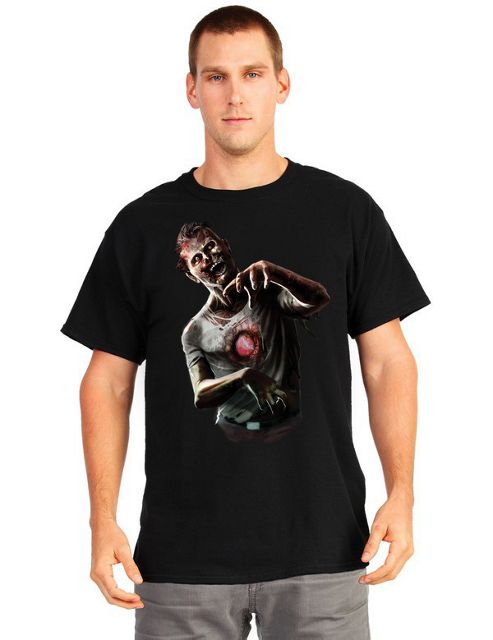 The Digital Dudz Beating Heart Zombie T-Shirt is a black 100% cotton T-shirt with an image of a zombie on the front. Inside the shirt is a Velcro pouch that can hold a smartphone, which can be used with the free Digital Dudz app to add a beating heart...