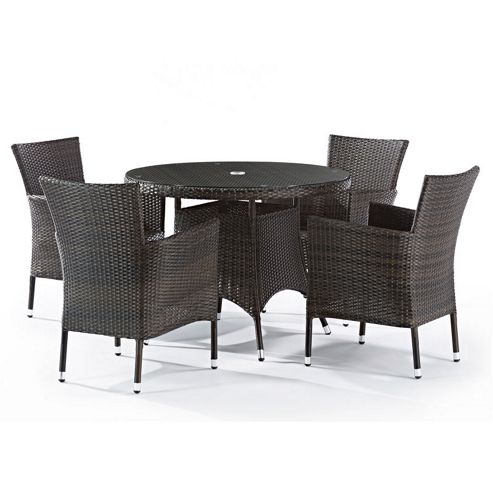 Gorgeous materials and sleek design make the Fazzio a truly elegant dining choice. Resiliant enough for dining outside but equally at home in the conservatory or sun lounge. Circular table features here with a glass table top for a traditional finish. Seats 4. Made from premium Win-tech flat weave rattan, commercial grade construction. Maintenance free. Parasol hole. Stackable Chairs. Cushions included. Chair: L:58 D:52 H:85 Table: DIA:100 H:75