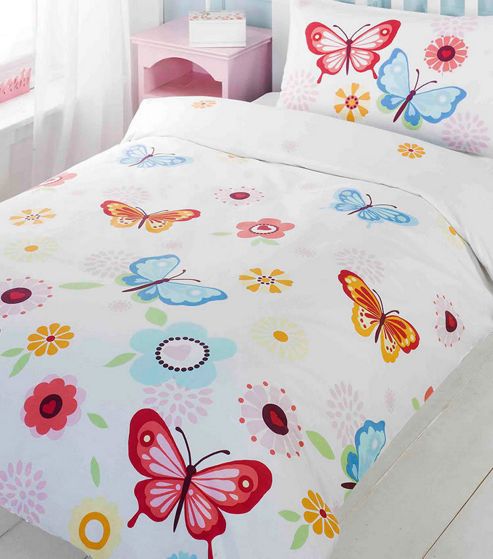 Butterflies Double Duvet. Girls, beautiful butterfly themed double duvet set with 2 matching pillowcases. A crisp, clean looking, white background with pink, blue and orange fluttering butterflies interspersed with stunningly coloured flowers making this...