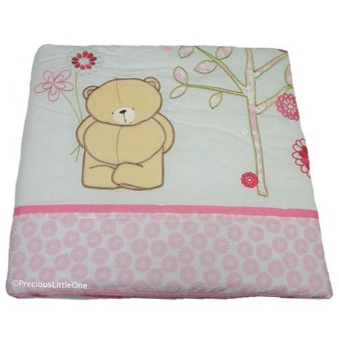 A warm padded cot bed quilt in a gorgeous design, featuring soft bear appliques, floral prints, delicate embroideries and velvet trims. Delightfully elegant, Forever Friends Beautiful speaks for itself, a design to be adored by little girls everywhere. A crisp white backdrop is teamed with a warming palette featuring soft shades of blush and pink shot with a gentle green. Delicate blossom embroideries and velvet trims combine with damask and floral prints for a charming vintage feel. The snugly and soft Forever Friends bear appliqu--s make this a truly beautiful design for the nursery, a room for sharing the warmest of hugs with your little one. Padded cot/cot bed quilt. 100 x 120cm.100% cotton (100% polyester filling). Machine washable. Part of a co-ordinating collection.