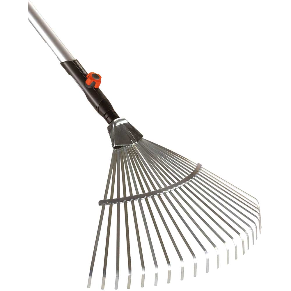 The Gardena combisystem Fan Rake is ideally suited for raking leaves, grass clippings and other garden debris. The flexible and zinc-plated spring-steel prongs and a large working width of 50 cm allow fast and effective work. Features & Ben...