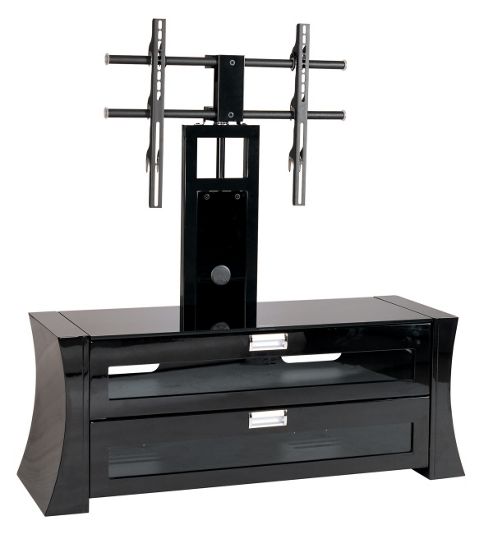 Sapphire SAP1200-GB with Canitlever BracketThe Gecko Sapphire SAP1200-GB has concave curved sides and a glorious gloss black finish with chrome trim forming a TV cabinet structure perfectly suited to the latest generations of LED LCD and Plasma television screens. The reflective gloss surfaces accentuate lighting to create an illusion of space. The wooden cabinet panels are supported by a strengthened steel framework. Intelligent darkened glass fronts conceal audio and video equipment from view yet enable IR and RF remote controls to function through the safety glass panels. The Gecko design team developed the Sapphire SAP1200-GB to reduce the frustration of using and configuring AV and home cinema systems. - Fits TV s with mounting holes spaced up to 700mm wide x 500mm high - Suitable for LED LCD and Plasma TV s up to 60 inch - Swivel bracket - Enclosed cabinet with darkened glass door conceals AV equipment and cabling. - High specification durable high gloss finish. - Elegant concave curved sides. - Highly developed steel strengthened chassis reduces resonance. - Geometrically engineered for maximum stability wherever weight is applied to the cabinet - Enclosed TV cabinet design prevents dust particle damage to AV components. - Lower door flap supported by damping arms for a smooth opening mechanism. - Darkened glass doors conceal AV components but enable remote controls to function. - Sophisticated cable management. - Each compartment has been measured to accommodate two full width AV components side by side. - Removable back panel for easier connection of AV equipment. - Includes cantilever bracket mount height adjustable with swivel facility. - Choice of either a darkened glass insert or cloth speaker grille supplied for upper compartment door.