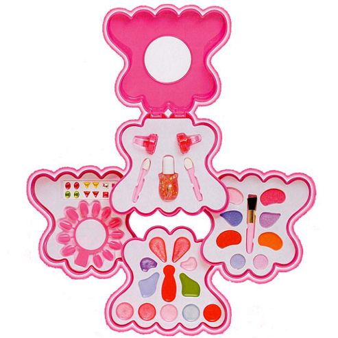 The Gentle Girls Butterfly Make Up Set is packed with everything wannabee make-up artists need in a handy, compact case. This set is specially designed for children aged five and up, and includes: Blusher Nail polish Eyeshadow Lipgloss Pretend nails with adhesive Sticky gems Brushes Mirror There are lots of different colours to choose from and they're all displayed in a neat pink butterfly-shaped case.