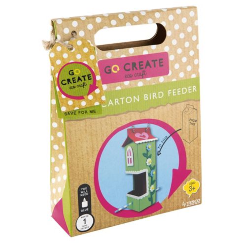 Go Create a Juice carton bird feeder by following the step-by-step instructions in this fun eco craft set. You---ll need to collect a 1 litre juice carton from the recycling bin, along with glue to stick the pieces together. The kit contains a handy ---Please can you save me your--- label to help you collect the carton ready to make a start. Transform your recycled carton into a practical and pretty bird feeder with the contents of the Go Create eco craft Juice carton bird feeder kit. Build your feeder using the foam, wooden dowelling, pom poms and card that are featured in this colourful set. The included instructions contain detailed illustrations and important information for you to follow to turn your recycled juice carton into an adorably cute Juice carton bird feeder.Adult supervision recommended.Wondering how it's made? Click here to see the video.