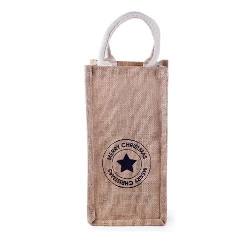 Christmas gift bag. A hessian gift bag, ideal for bottle presents with a black star print. A sturdy and alternative way to present gifts to loved ones or friends. Total size 30cm tall x 15cm wide x 15cm depth. Total length with handles is 40cm.
