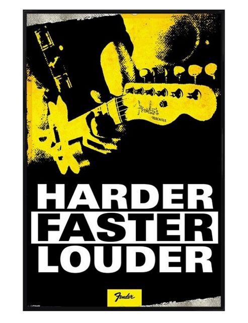 A poster of Fender slogan Harder, Faster, Louder. Complete with a 61cm x 91.5cm gloss black plastic frame, fronted with transparent Perspex and ready to hang in your home.