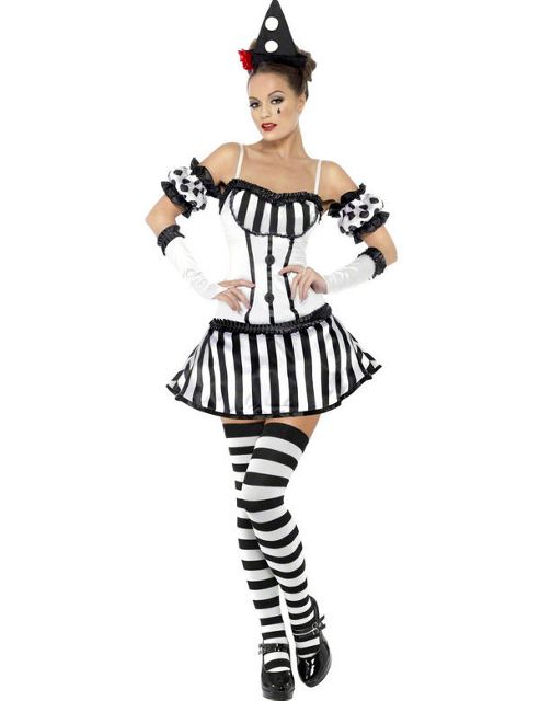 Our beautiful Ladies' Clown Outfit is printed with black and white stripes and trimmed with ribbon and lace. A stunning fancy dress choice that would be perfect for a circus party! Costume includes: Dress Hat Sleeves Gloves The Ladies' Clown Outfit includes a black and white striped dress with a ruffled trim around the top of the skirt and the top of the bust line. The dress has black ribbon stripes down the front of the bodice, printed pom poms and black lace around the bust. Also included is a black hat with fluffy pom poms and a red floral decoration, a pair of black and white dotted sleeves and long black and white gloves.