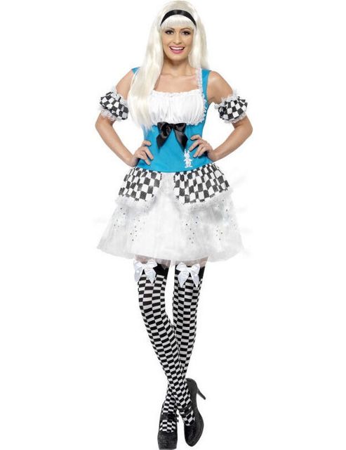 Stand out from the crowd with our amazing Light Up Alice Costume! This fun fancy dress idea has lights in the skirt, so even if you're in a club, everyone will be able to see your amazing outfit! Costume includes: Light-Up Dress Separate Sleeves The Light Up Alice Costume includes a blue and white dress with black and white checked panels on the skirt, a printed rabbit detail and a black ribbon bow. The skirt has lights sewn into it, so that it can light up in the dark. Also included is a pair of black and white checked sleeves with a white lace trim.