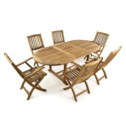Classic Design, seats 6 adult comfortably, single extending table, fold away chairs, parasol hole. Delivered fully assembled Product Dimensions in Centimetres (CM): Arm Chair- Length:67 Depth:65 Height:93 Table- Length:200 Depth:100 Height:73 cm