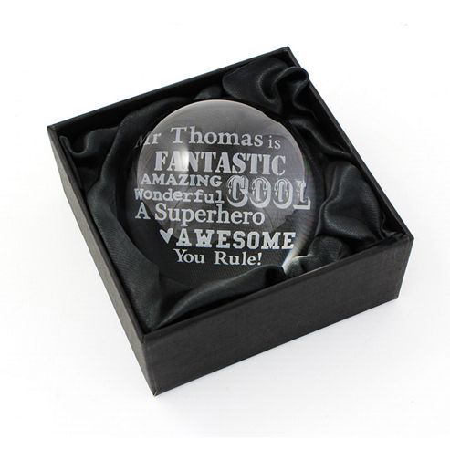 Personalise this glass domed paperweight for an attractive, thoughtful and also practical gift. Size 7.5 x 7.5 x 4cm. Personalise with a name up to 12 characters, and a message of 15 characters. 'Is', 'Fantastic,Amazing, Wonderful, Cool, A Superhero, the bestest ever, Awesome' is fixed text. Personalisation will appear exactly how is entered, if uppercase is required, please enter in all capitals. PLEASE NOTE This is not currently available on a next day delivery. Please email [email protected] quoting your order number, immediately after placing your order with your required personalisation. Please allow approximately 3 days for production.
