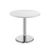Circular meeting room / dining table. 25mm MFC table top finish. Scratch, heat and stain resistant. Stylish chrome trumpet base. Overall Width (mm): 800. Overall Height (mm): 725. Colour Finish: White.