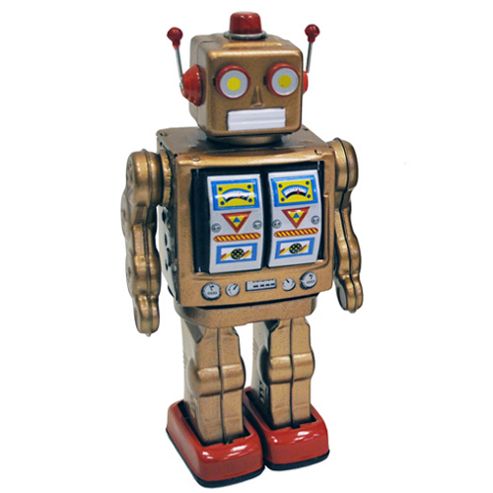 Made from tin and beautifully transfer-printed this collectable ornament is perfect for the nostalgic and young at heart. Insert 2 x D type batteries (not supplied), switch on and watch the action! The robot walks, the main body rotates then stops and two panels open to reveal to mini guns which flash red - with sound effects, before setting off across the floor looking for the next battle. PLEASE NOTE: This product is not suitable to be used as a childrens toy. Red lens on Robots head DOES NOT flash.