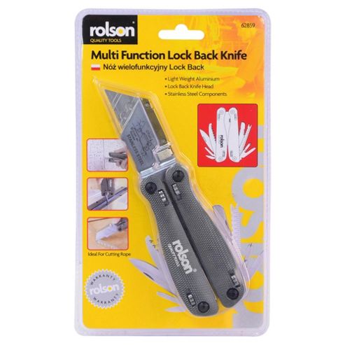 Made from lightweight aluminium with stainless steel components, the Rolson function lock back knife can stand up to most DIY tasks. With a knife, saw, small slotted screwdriver, awl, hook remover, bottle opener, scale/file, Philips screwdriver and medium slotted screwdriver, the multifunction lock back knife is an extremely useful tool for a household. The ergonomic shaped handle will provide you the required comfort for lengthy periods.