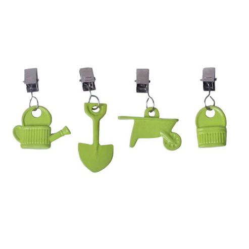 Tablecloth weights. A set of four tablecloth weights, made from green coloured metal in varying garden equipment designs. The perfect accessory for Summer, a must have for BBQs and buffets! Completed with a secure clip, sizes vary from 3 to 5cm length....