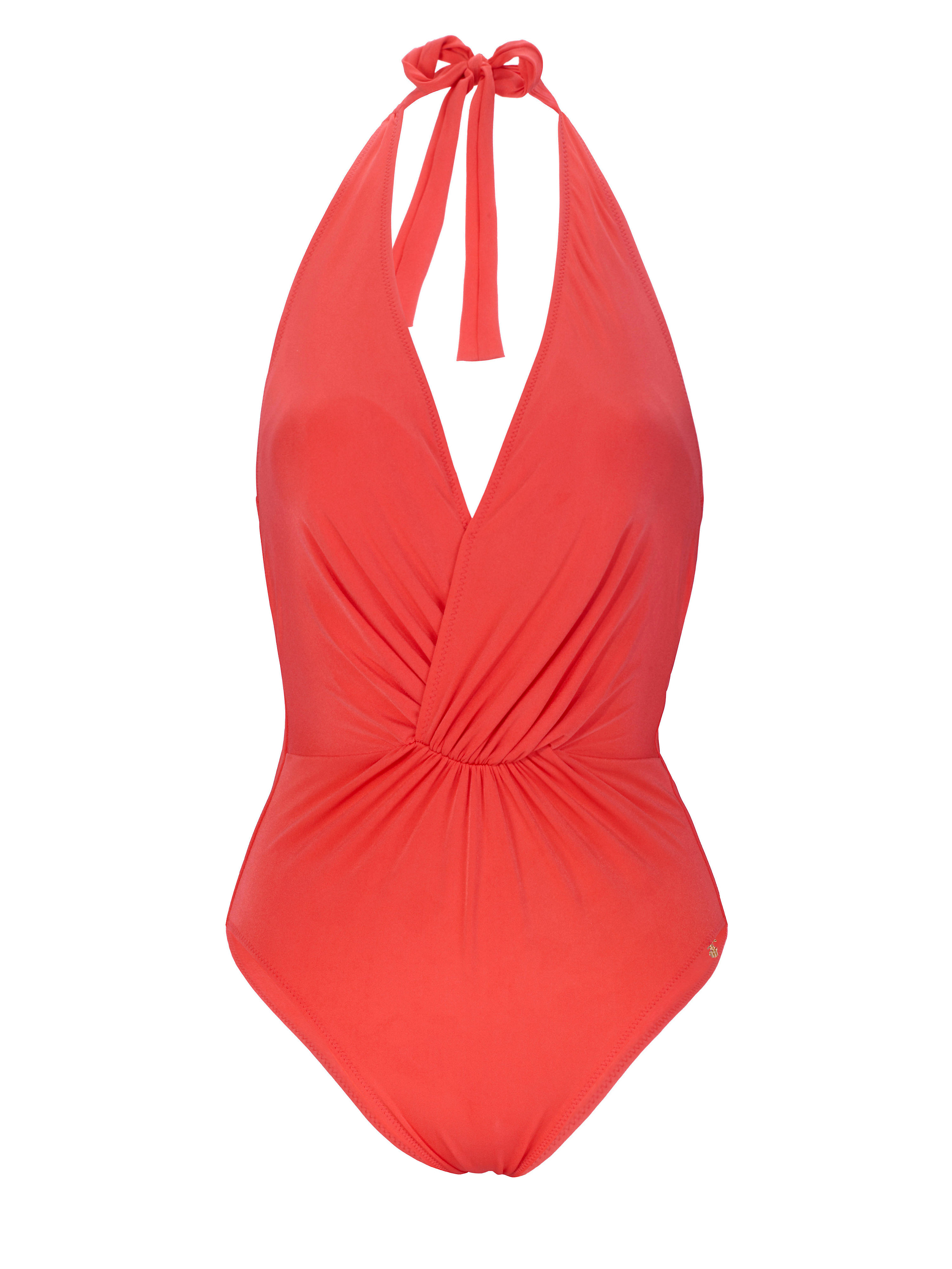 Swimsuit by Opera 72% polyamide, 28% elastane. Halter-neck with a tie and additional detachable strap at the back. Attractive swimsuit with a low wrapover V neckline, gatherings at the bust, under-bust support band, lined bust and doubled finish for a...