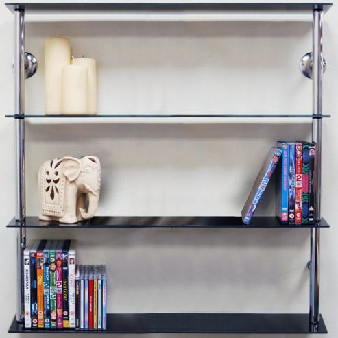Tall wall mounted black glass shelves with a sturdy tubular chromed frame. Resting on the ground with two securing plates at the top for attaching to a wall, this 10 tier unit is ideal for DVDs, Blu-rays, computer games, CDs, books, collectables or ornaments....