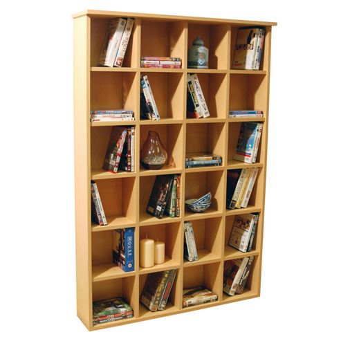 Free standing pigeon hole unit great for media storage or for displaying treasured objects. Very simple design within an incredibly small footprint - it only projects 20cm from your wall.Features: Storage shelves; Material: Particle board / PVC foil; Four columns by six rows making 24 cubbies; Maximum capacity 312 DVDs / Blu-rays / computer games or 480 CDs; Each measuring 20cm H x 20cm W x 15cm D; Assembly required;