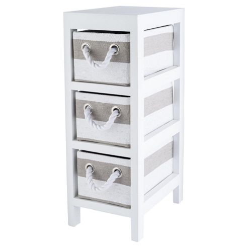This gorgeous striped caddy comes in a grey and white finish. This compact unit features 3 draws with a white rope handle, which are ideal for bathrooms with limited floor space. The striped caddy by Tesco can easily store small cosmetics and bathroom items out of sight. This freestanding unit is made from a sturdy MDF structure.