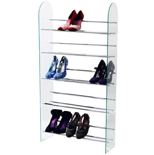 Fantastic shoe storage unit with glass side and sturdy metal rods which make five shelves - can hold up to 15 pairs of ladies shoes/boots OR 12 pairs of mens shoes. Because of the glass sides the shelves look like they are floating in mid-air. Perfect...