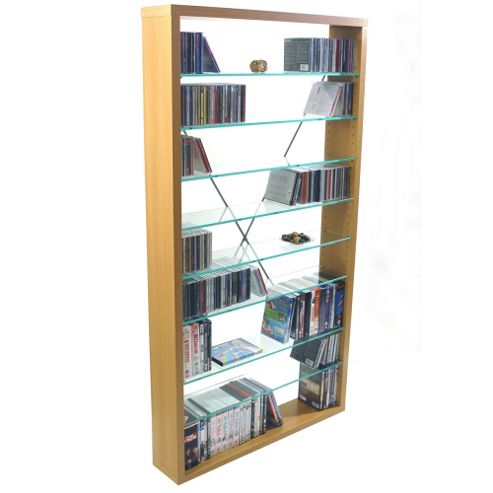 Slimline free standing beech media / storage unit with 9 fully adjustable clear glass shelves and chunky beech effect modern frame. (Only 8 glass shelves shown in the image but 9 are supplied) Designed for DVDs / Blu-rays, computer games, books, CDs,...