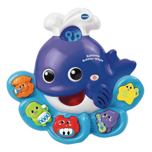 You---re little one will have a whale of a time with the VTech Bubble Play toy. This adorable companion features bubble-blowing technology that released bubbles in time with the music and sounds. This easy-to-handle Bubble Play whale by VTech features 5 large, bright buttons that when pressed, will help teach your child about colours, animals and rhythm. This VTech bath time toy comes with 2 suction cups that allow you to attach the Bubble Play whale to the bathtub, if you chose. If not, the whale is fully waterproof and has a switch for turning the bubbles on or off.Batteries included.