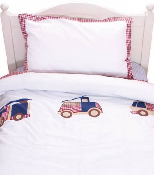 Fire Trucks, Single Bedding. Childrens 100% cotton, duvet cover with a series of blue and red checked fire engines chugging along the top. This top quality bed linen set is edged with a red and white checked border, which is replicated on the pillow case.